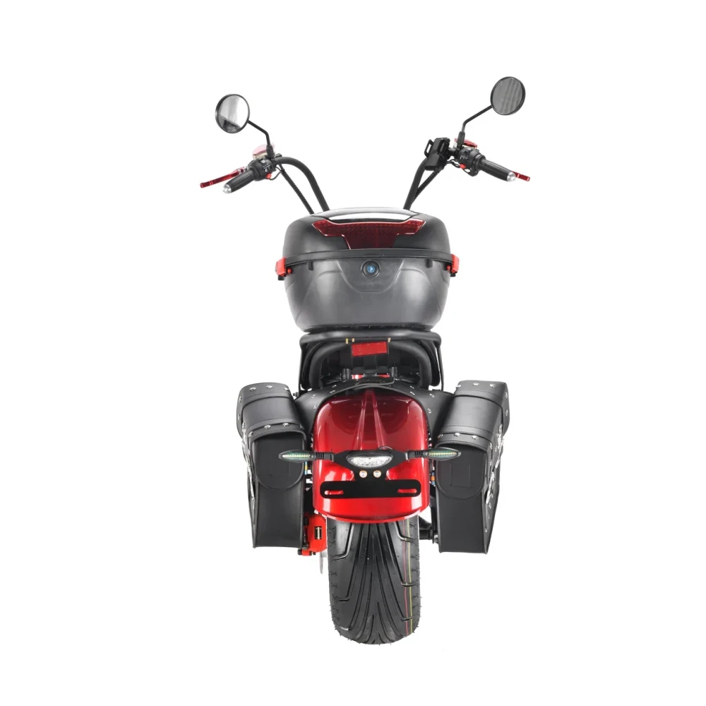Электроскутер Citycoco WS Wild Wheel 3950W производит впечатление своим незаурядным дизайном, напоминающим мотоцикл чоппер. Сочетание черного корпуса и красных элементов выгодно выделяет данную модель в потоке городского транспорта. Технические характеристики порадуют любителей быстрой езды. Мощный мотор 3950 W позволяет развивать максимальную скорость 71 км/час и легко преодолевать подъемы. При этом электроскутер остаётся экологически чистым транспортом, не требующим использования какого-либо топлива. Достаточно зарядить аккумулятор в течение 6 часов и ваш транспорт готов проехать до 40 км пути. Широкие колеса диаметром 12 дюймов создают отличное сцепление с дорогой, позволяя комфортно передвигаться по асфальту, плитке и грунтовому покрытию. Передний и задний амортизаторы эффективно поглощают неровности, снижают вибрацию и тряску, максимально повышая комфорт водителя. Два электронных дисплея позволяют водителю оценить основные показатели движения и остаточный уровень заряда батареи. Электроскутер оснащён встроенной сигнализацией и качественной системой освещения, которая включает яркую переднюю фару, поворотники и стоп-сигналы.
