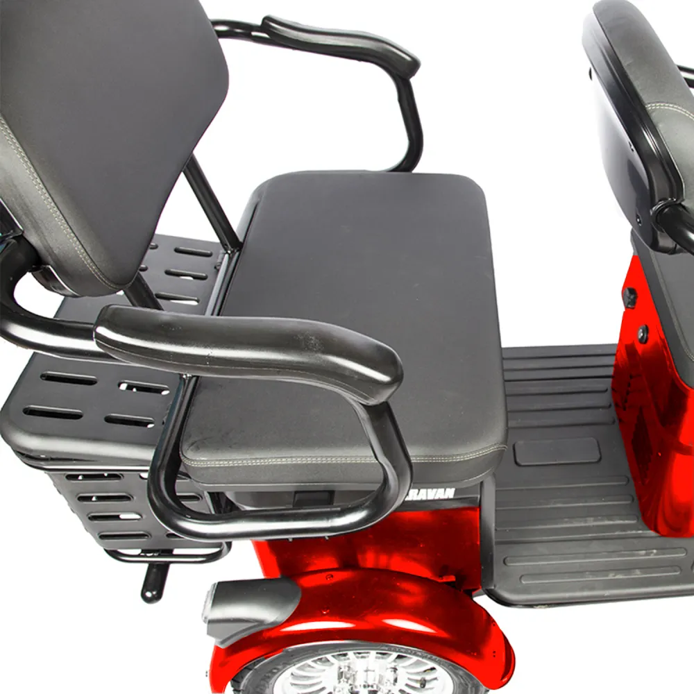 Трицикл Rutrike Караван красный – яркая и заметная техника популярная средств отечественных пользователей и жителей СНГ. Трицикл с грузоподъемностью 150 кг рассчитан на 3 человек, 2 из которых пассажира. Изготовлен с учетом пожеланий пользователей и предпринимателей. Отличается от других вариантов отличными показателями комфорта. Широкое вместительное сиденье для пассажиров оснащено спинкой и подлокотниками, удобное для ознакомления с достопримечательностями и отдыха в парковой зоне.