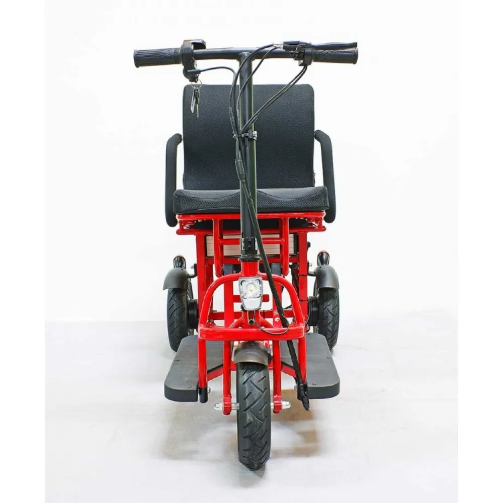 Техника изготовлена в современном дизайне, оснащена комфортным вместительным сиденьем с подлокотниками и удобной высокой спинкой. Езда в электротрицикле превращается в отдых и удовольствие. Модель оснащена двигателем мощностью 350 Вт, в сочетании емкой АКБ позволяет преодолевать приличное расстояние. Батарея размещена в недоступном для пользователя месте, не мешает ездоку при эксплуатации тс.